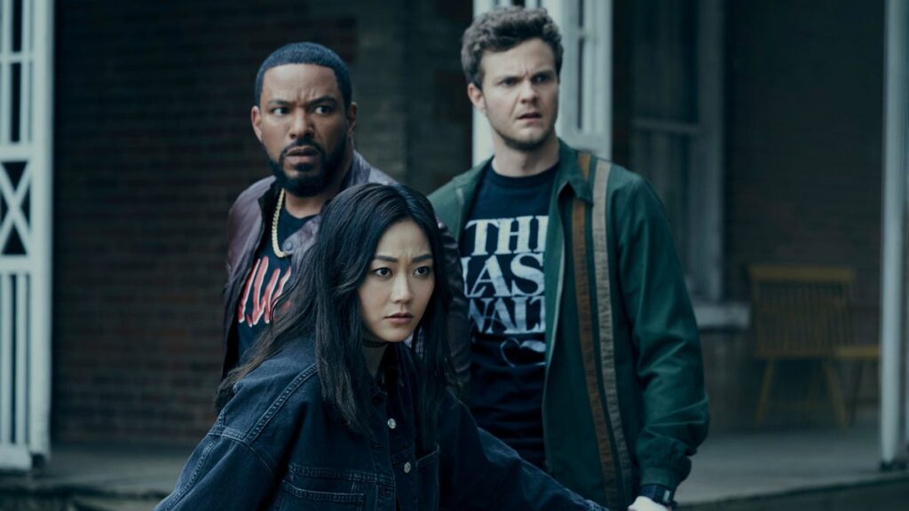 M.M. (Laz Alonso), Kimiko (Karen Fukuhara), and Hughie (Jack Quaid) in a scene from The Boys.